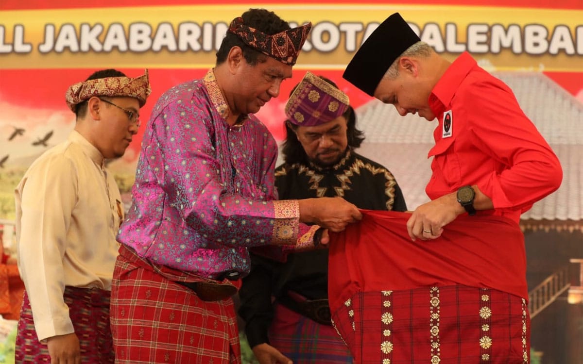 Tak hanya disambut antusias, Ganjar juga mendapat kehormatan dari Sultan Palembang Darussalam itu. Ganjar dipakaikan Rumpak, pakaian khas Palembang. Rumpak berupa kain songket tenun.