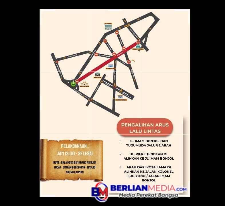 “Masyarakat yang hendak beraktivitas di kawasan perdagangan Kota Lama maupun Simpang Lima diimbau untuk menyesuaikan waktu perjalanan. Warga masyarakat juga diminta untuk tidak memarkir kendaraan di sepanjang rute kirab serta mematuhi arahan petugas,” tutur Kepala Dishub Kota Semarang, Danang Kurniawan.