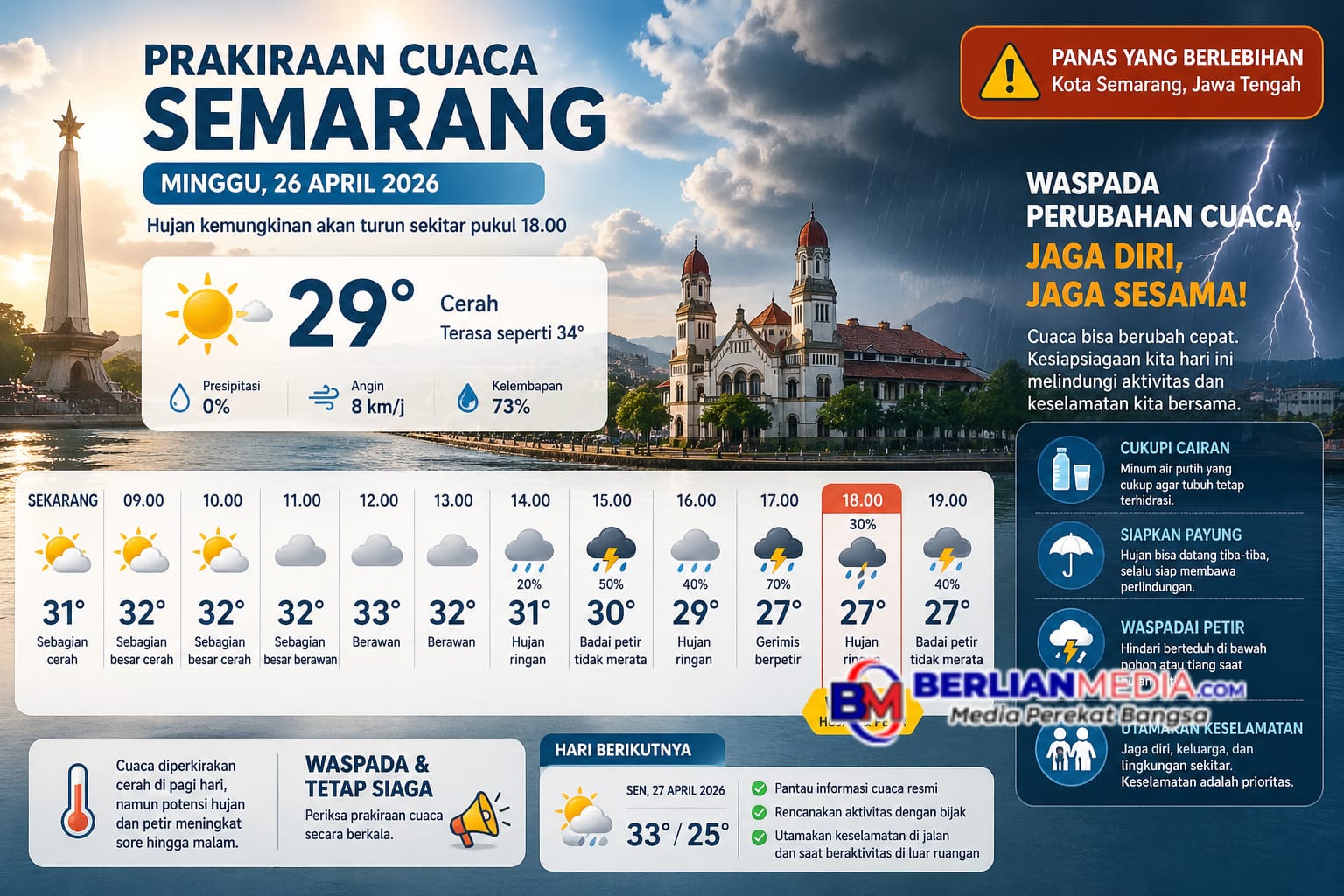 SEMARANG [Berlianmedia]- Cuaca di Kota Semarang pada Minggu, 26 April 2026, memperlihatkan pola yang kontras, pagi hingga siang didominasi panas, sementara sore hingga malam berpotensi diguyur hujan disertai petir.