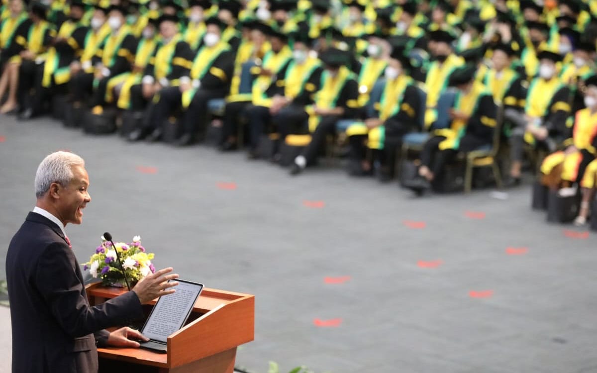 Dalam kesempatan itu, Ganjar membakar semangat lulusan Universitas Moestopo agar tak gentar meski situasi tak menentu akibat krisis global.