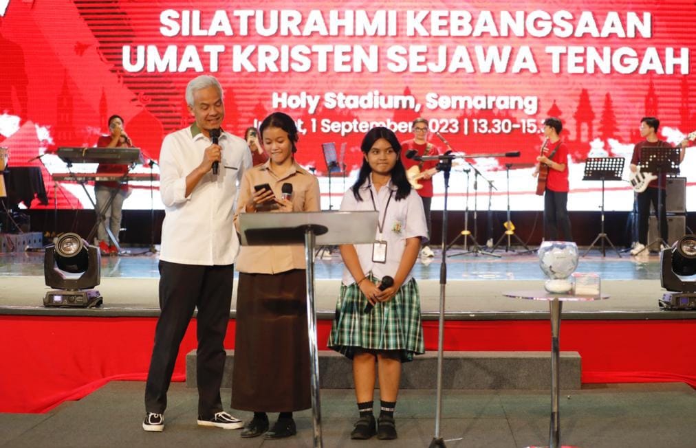 SEMARANG[Berlianmedia] – Gubernur Jawa Tengah Ganjar Pranowo mendapat hadiah istimewa saat hadir di acara ‘Silaturahmi Kebangsaan Umat Kristen se-Jawa Tengah’, di Holy Stadium Semarang, Jumat (1/9) sore. Hadir ribuan umat Kristiani termasuk anak-anak sekolah Kristen, dalam kegiatan itu.