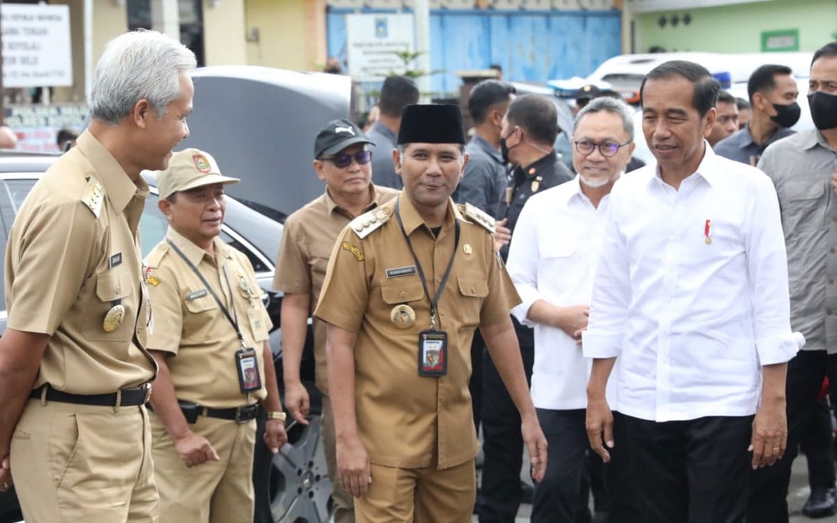 Ganjar dan Jokowi kemudian masuk ke dalam pasar. Keduanya berdialog dengan para pedagang terkait harga dan stok kebutuhan pokok selama ramadhan.