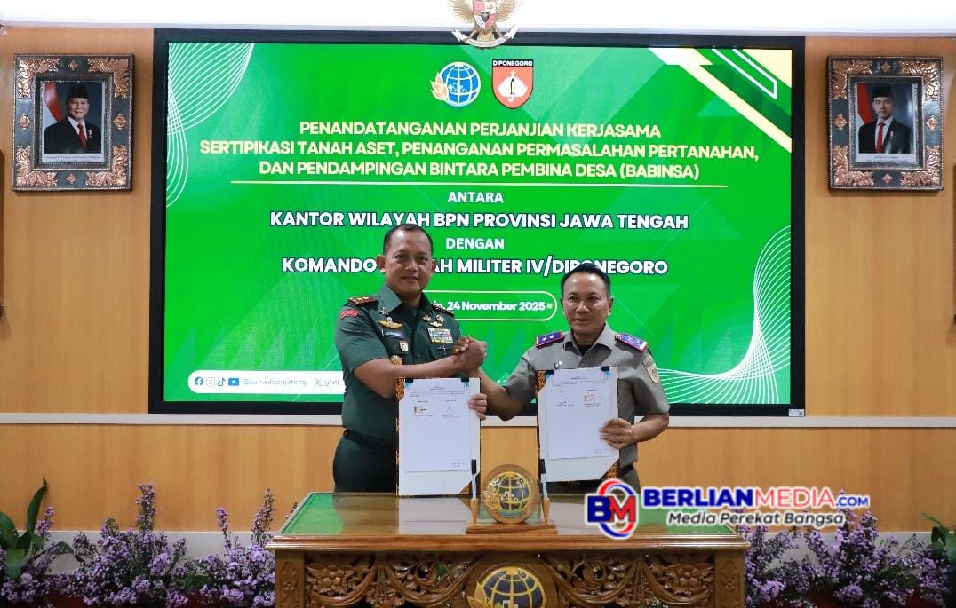 SEMARANG [Berlianmedia]- Kanwil BPN Provinsi Jawa Tengah bersama Kodam IV/Diponegoro, menandatangani Perjanjian Kerja Sama (PKS) terkait Sertipikasi Tanah Aset, Penanganan Permasalahan Pertanahan serta Pendampingan Babinsa dalam mendukung tertib administrasi pertanahan di tingkat desa, Selasa (24/11).