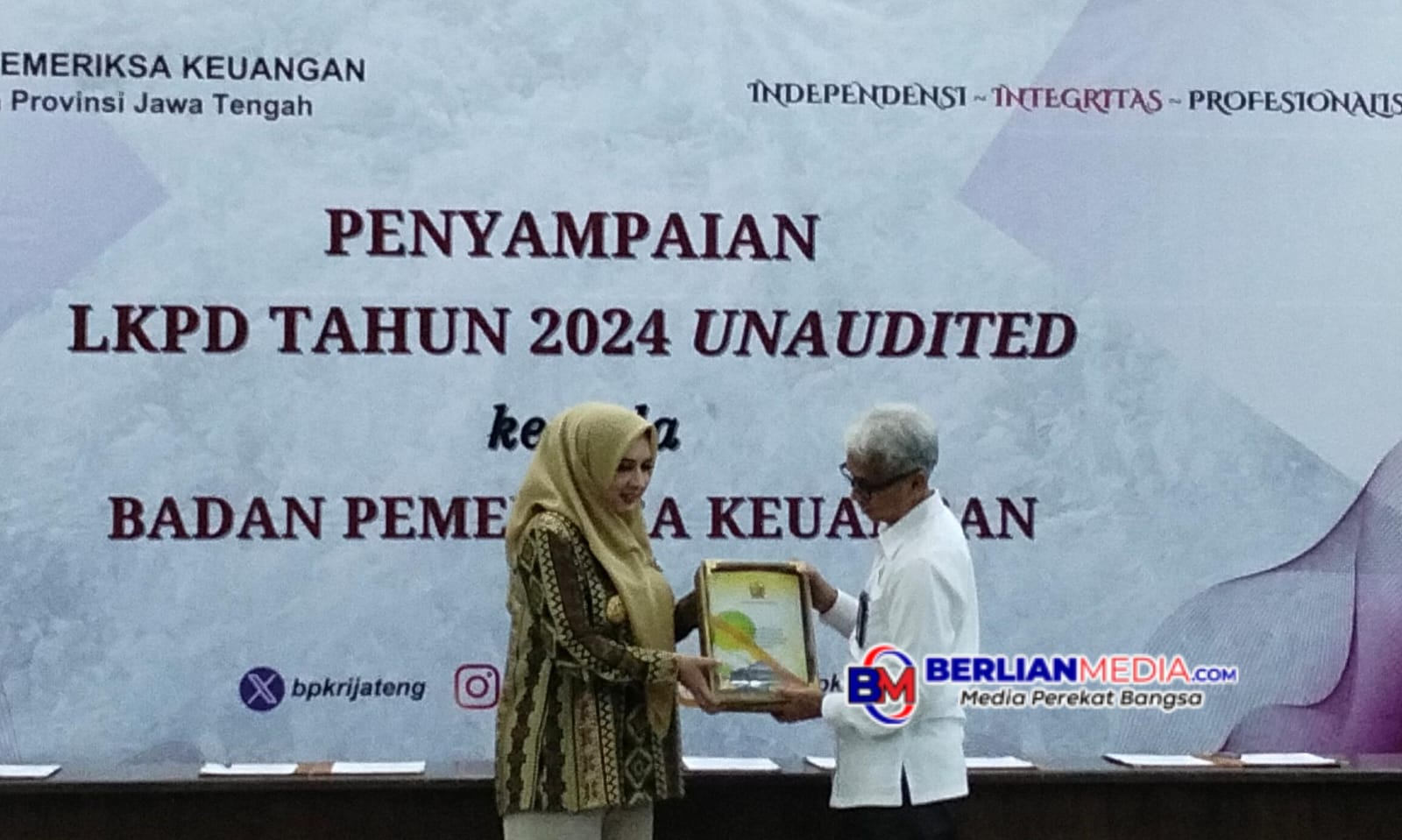 Bupati Pekalongan Fadia A Rafiq saat menyerahkan Laporan Keuangan Pemerintah Daerah (LKPD) tahun 2024 unaudited ke Kepala BPK Perwakilan Provinsi Jawa Tengah Ahmad Luthfi H. Rahmatullah tahun 2025 lalu, di auditorium lantai 3 gedung BPK Jateng, Rabu (26/3/2025). Foto : Dok Absa