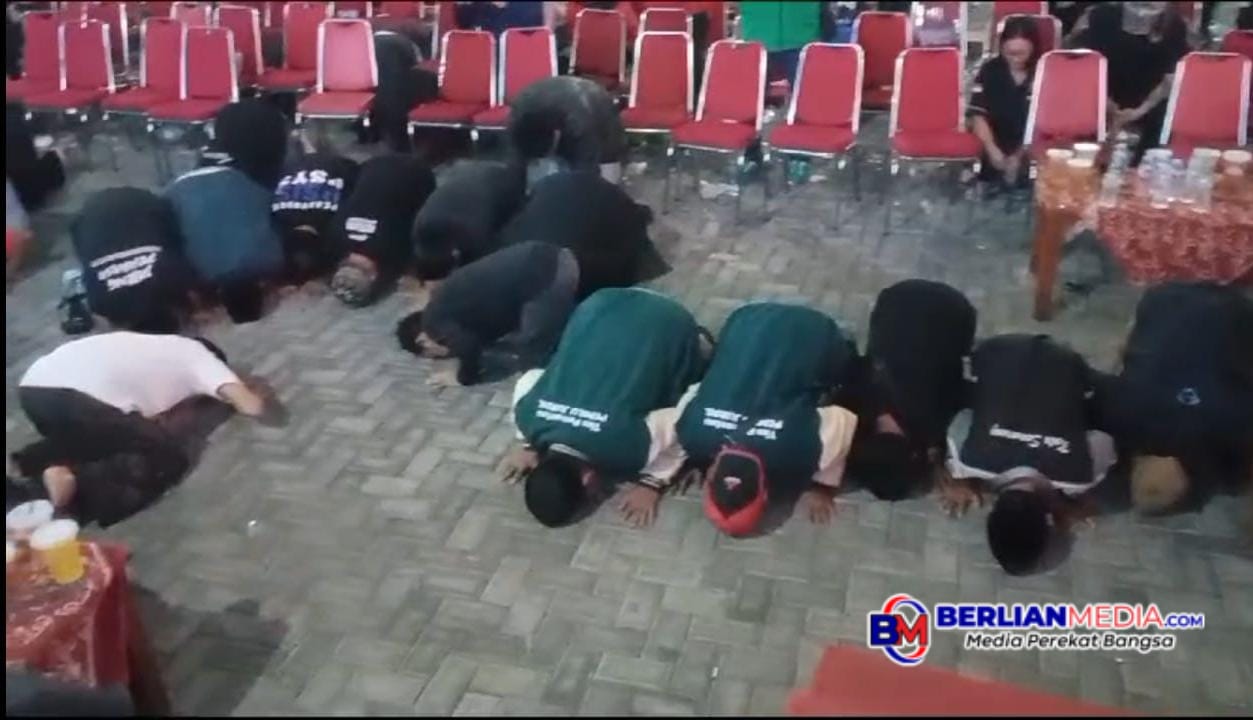 SEMARANG [Berlianmedia]- Pengasuh Santri Ndalan Nusantara, Muchamad Nurul Huda melakukan sujud syukur bersama para santri dan tim pemenangan Jaguar (Jagoanku Agustin dan Iswar) di Posko Pemenangan Jl Prof Dr Cipto Semarang, Rabu malam (27/11).