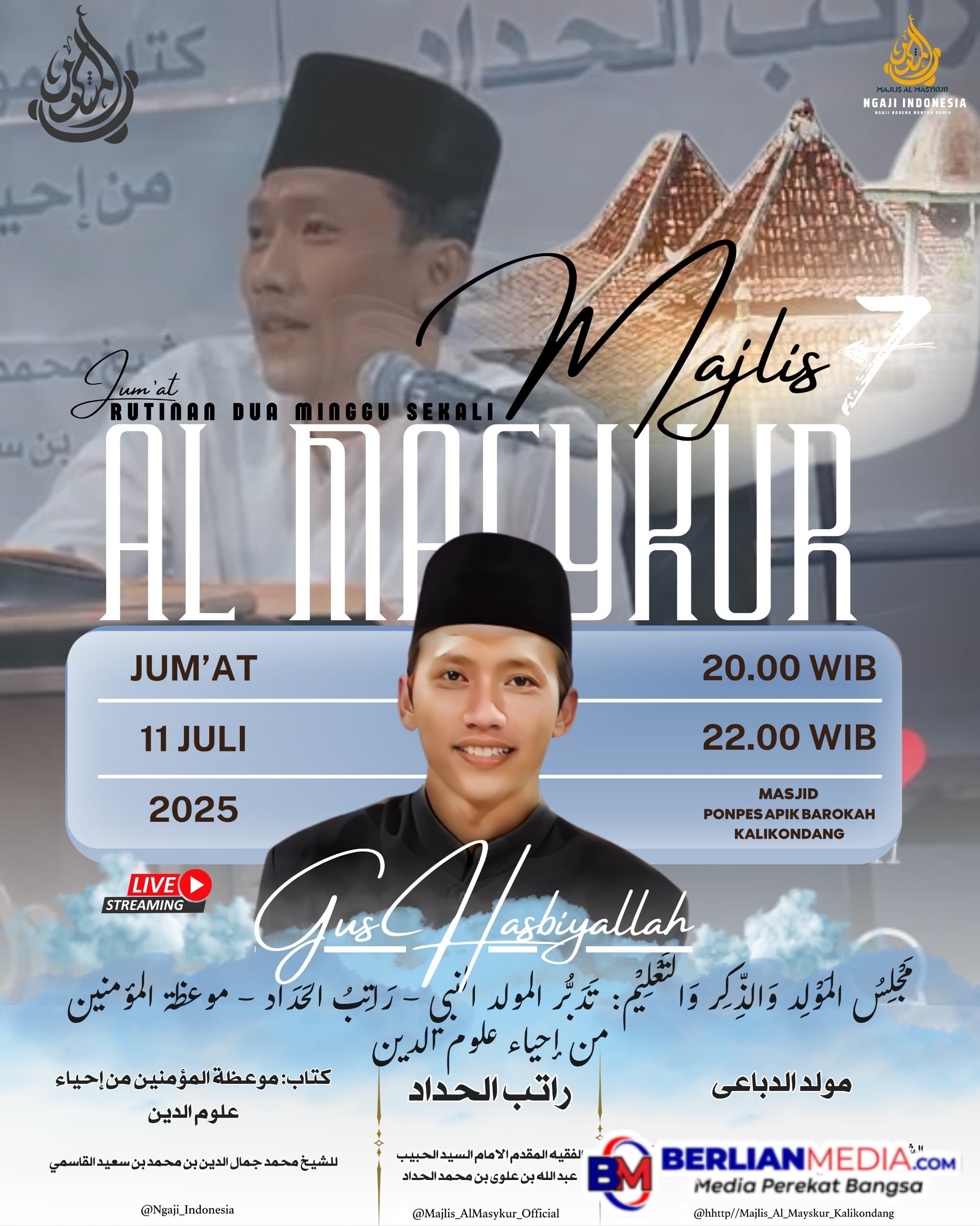 DEMAK [Berlianmedia] — Dalam upaya membumikan nilai-nilai keislaman yang penuh hikmah dan rahmat, Majlis al-Masykur kembali menghadirkan forum keilmuan dan dzikir bertajuk Ngaji Indonesia #7, yang akan digelar pada Jumat malam, (11/7), pukul 20.00–22.00 WIB, di Masjid Pondok Pesantren Apik Barokah, Kalikondang, Demak.