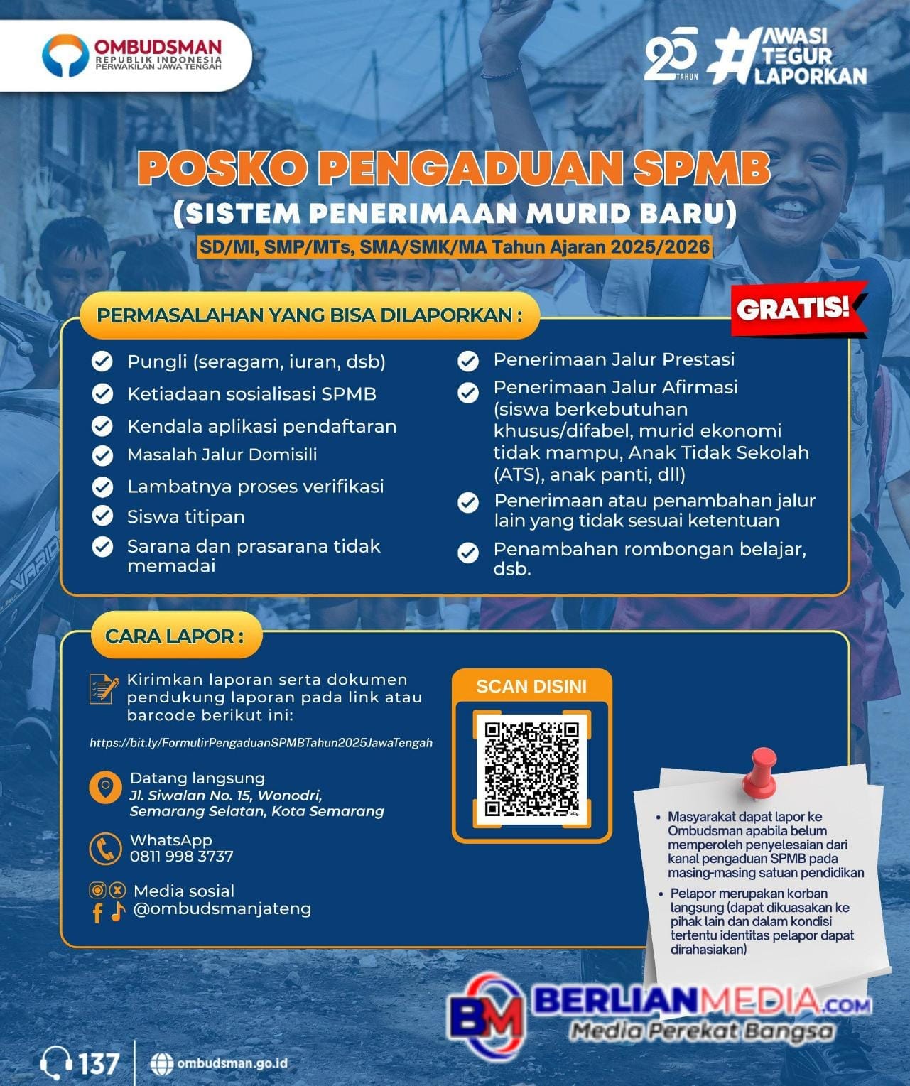 SEMARANG [Berlianmedia]- Dalam rangka melaksanakan pengawasan Sistem Penerimaan Murid Baru (SPMB) Tahun Ajaran 2025/2026, Ombudsman RI Perwakilan Jawa Tengah membuka Posko Pengaduan SPMB tahun 2025.