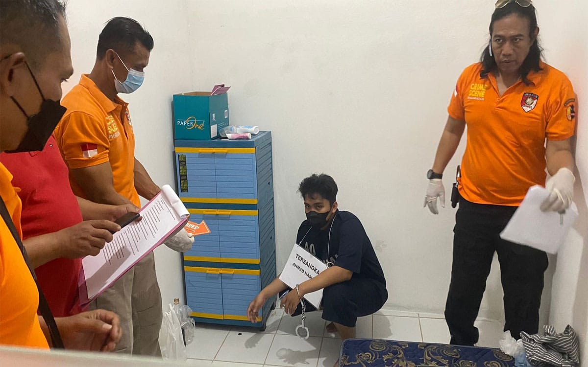 Dalam rekonstruksi ini, Polisi menghadirkan pelaku Ahmad Nasir (22) untuk memperagakan 45 adegan.