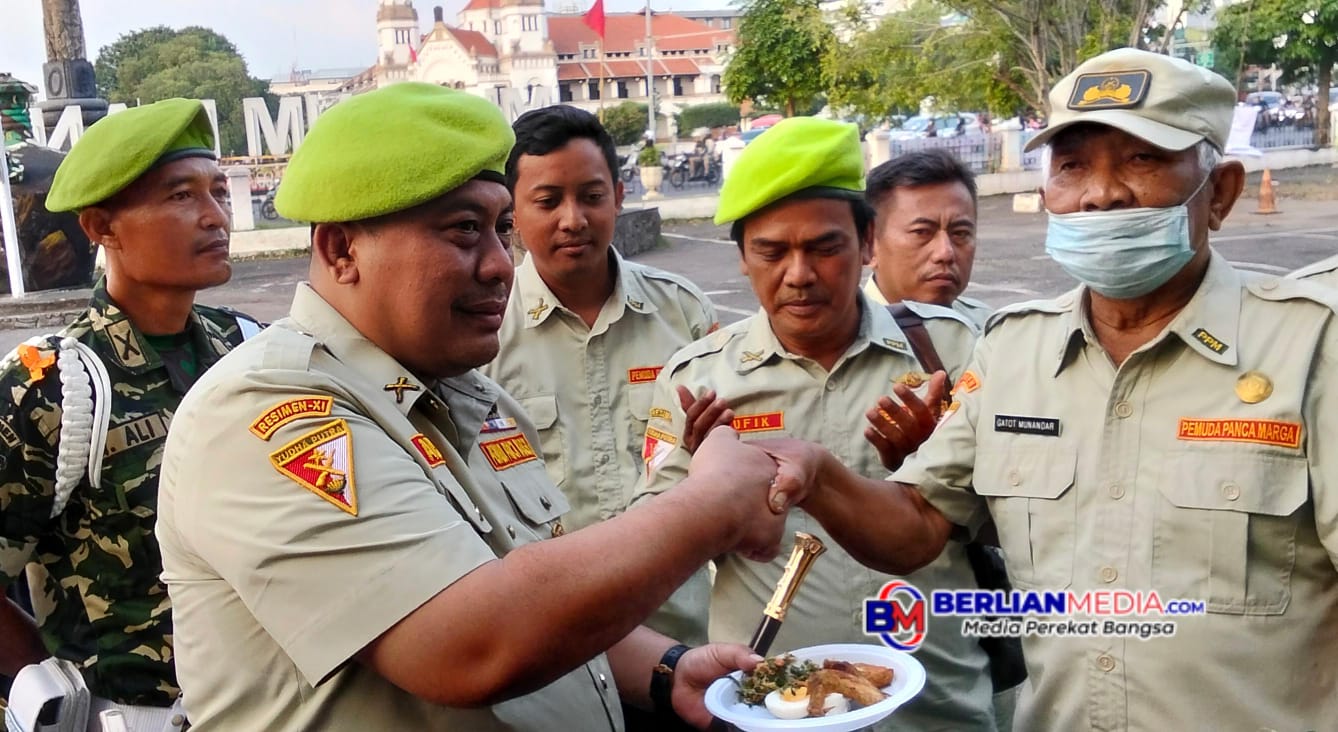 Caption : Ketua Mada PPM LVRI PD Jawa Tengah Adhi Siswanto Wisnu Nugroho menerima nasi tumpeng dari Sesepuh dan Pendiri PPM LVRI Gatot Munandar, di halaman Museum Perjuangan Mandala Bhakti Tugu Muda, Semarang, Jum’at (27/6). Foto : Absa