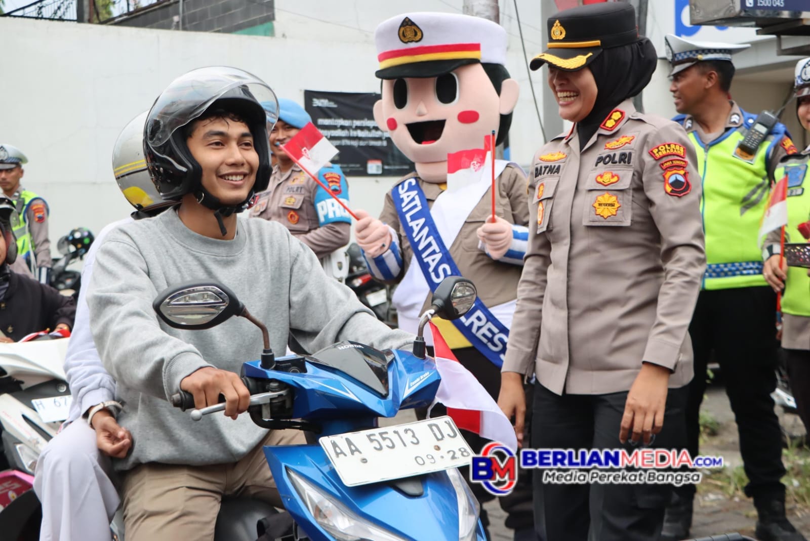 Dengan senyum, sapa dan salam, nampak AKBP Ratna beserta personel Polres Semarang membagikan bendera gratis kepada pengguna jalan, baik roda dua maupun roda empat.