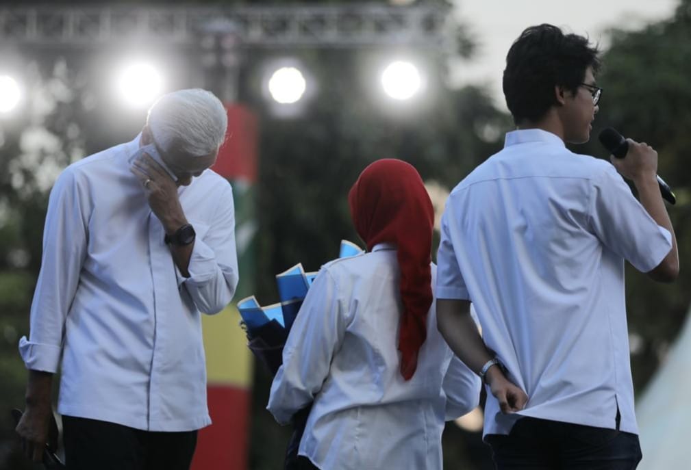 Mata Ganjar langsung memerah, air mata menetes. Berkali-kali, dia mengusap air mata dengan sapu tangan yang dia bawa. Tepuk tangan dari ribuan warga Jateng mencoba menguatkannya.