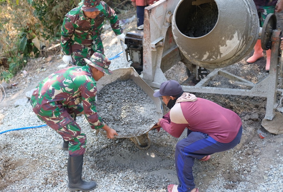 Setiap hari, suasana kekeluargaan begitu terasa di lokasi TMMD. Anggota TNI dan warga desa bahu-membahu mengerjakan berbagai tugas, mulai dari pengangkutan material, pembuatan adonan semen, hingga pengecatan. Tak ada sekat di antara mereka, semua bekerja sama dengan penuh semangat.
